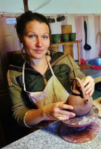 « Assistée de mon fidèle complice le tour de potier, je conçois des objets à usage domestique en grès émaillé tels que des tasses, des bols, des théières, des brocs, des porte-savons, des mangeoires à oiseaux… »